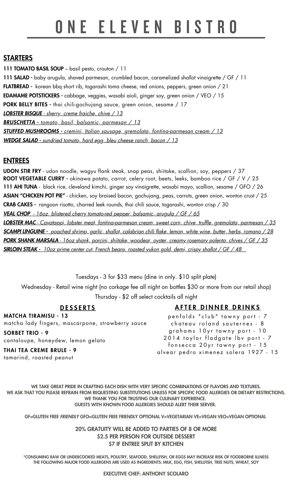 Experience the exceptional flavors of our seasonal menu at home with our convenient online ordering. Explore our wine shop for a curated selection of wines that perfectly complement your meals. Enjoy the quality and creativity of One Eleven Bistro, delivered to your door.